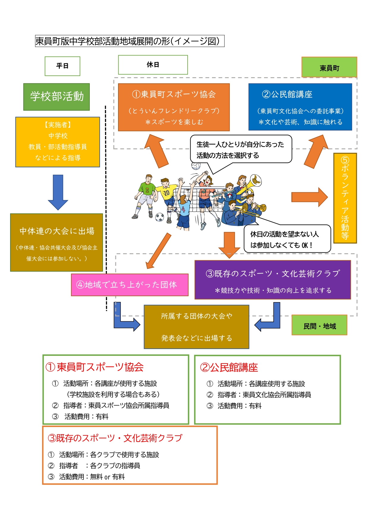 本町におきましても、令和5年度より設置している「東員町部活動在り方検討会」において、休日部活動の地域展開の推進などについて、検討を進めると同時に、休日の活動の受け皿となる団体や活動場所の調整を進めているところです。そして、それらの検討・調整を踏まえ、本町では全ての町立中学校において、令和9年度の夏以降を目途に休日の中学校部活動の地域展開を目指しています。