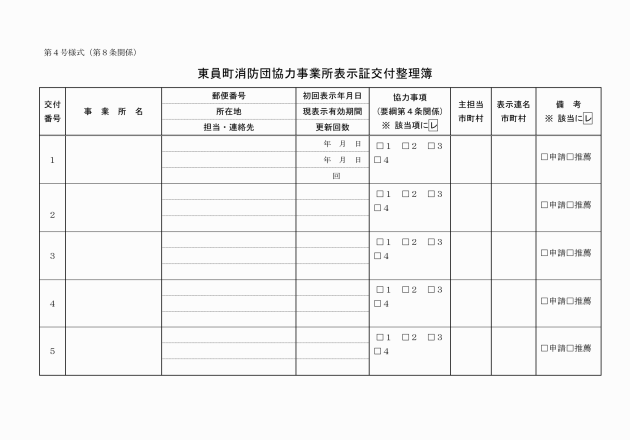 第8条 表示証の交付に際して、町長は、東員町消防団等協力事業所表示証交付整理簿(第4号様式)を備え付け、表示証の交付に関する協力事業所の名称、住所、有効期間等の必要事項を記録するものとする。
